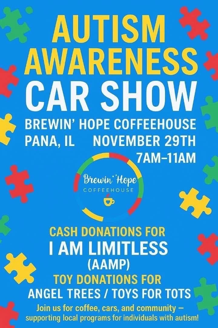 The car show will take place outside Brewin’ Hope Coffeehouse, where guests can grab warm drinks as they walk through the lineup of vehicles. Volunteers will be on hand to welcome families and share information about the groups benefitting from the event. Cash donations collected that morning will support ‘I Am Limitless,’ a program connected to the Autism and Awareness Movement Project in Pana, that provides opportunities for individuals with autism. Organizers note that these funds help expand activities and resources throughout the year.