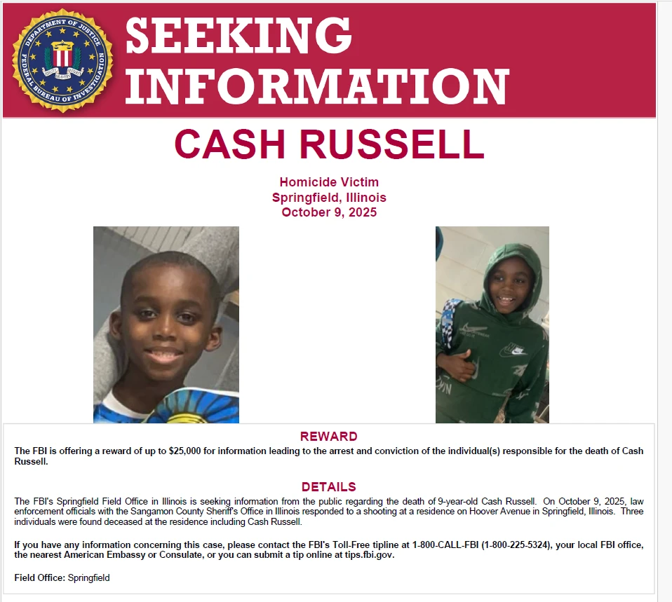 Deputies were called to a home on Hoover Street on October 9th, where investigators found three people shot to death. One of the victims was 9-year-old Cash Russell. The Sheriff’s Office continues to investigate, with assistance from the FBI’s Springfield Field Office.