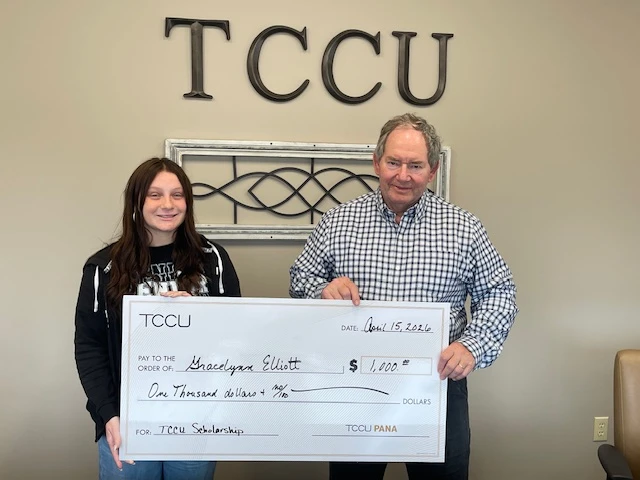 Gracelynn Elliott(LEFT) and TCCU Pana Branch Manager, Al Stupek (Right)