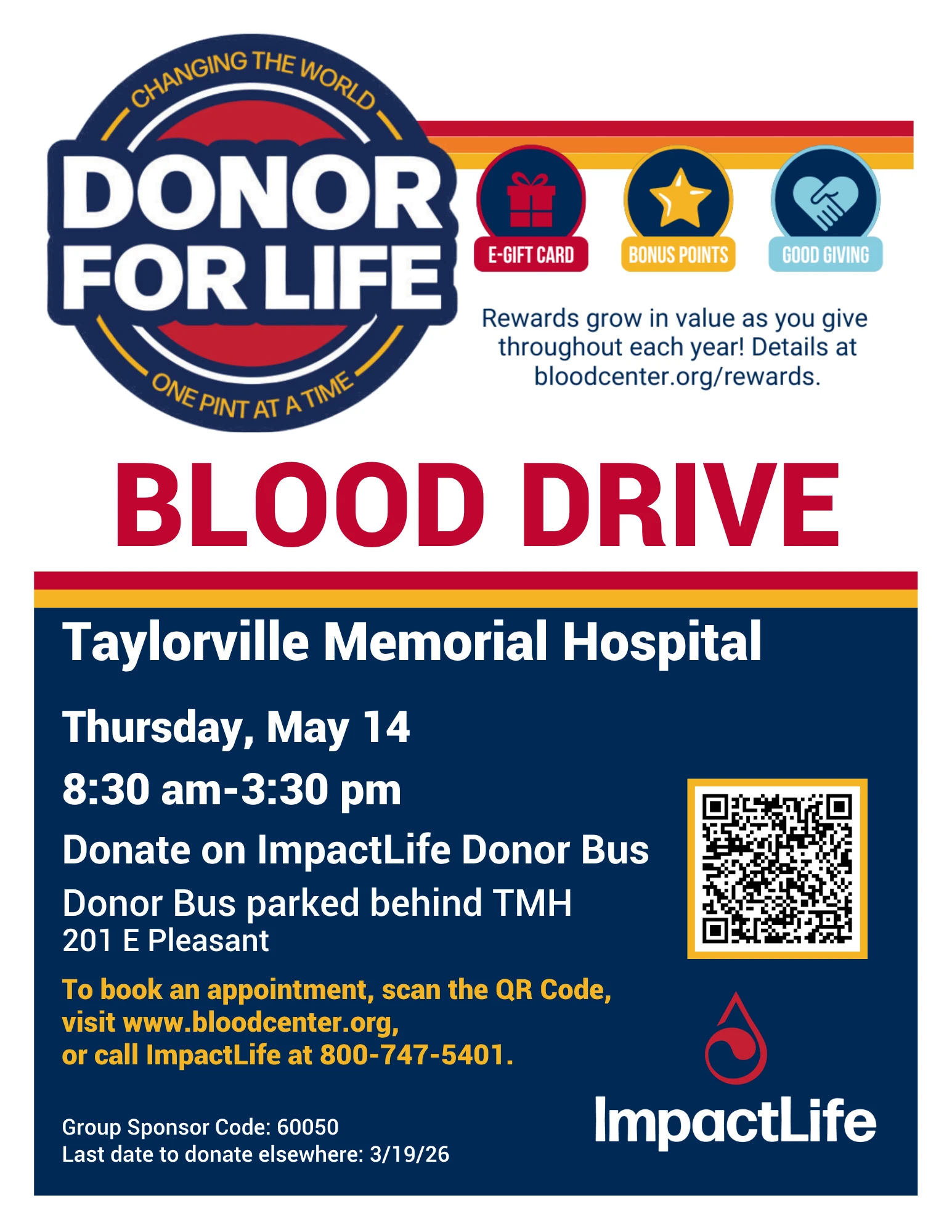 On Thursday, May 14th, from 8:30 AM until 3:30 PM, you can donate blood at the ImpactLife Donor Bus. The bus will be parked behind Taylorville Memorial Hospital, located at 201 E Pleasant St in Taylorville.
