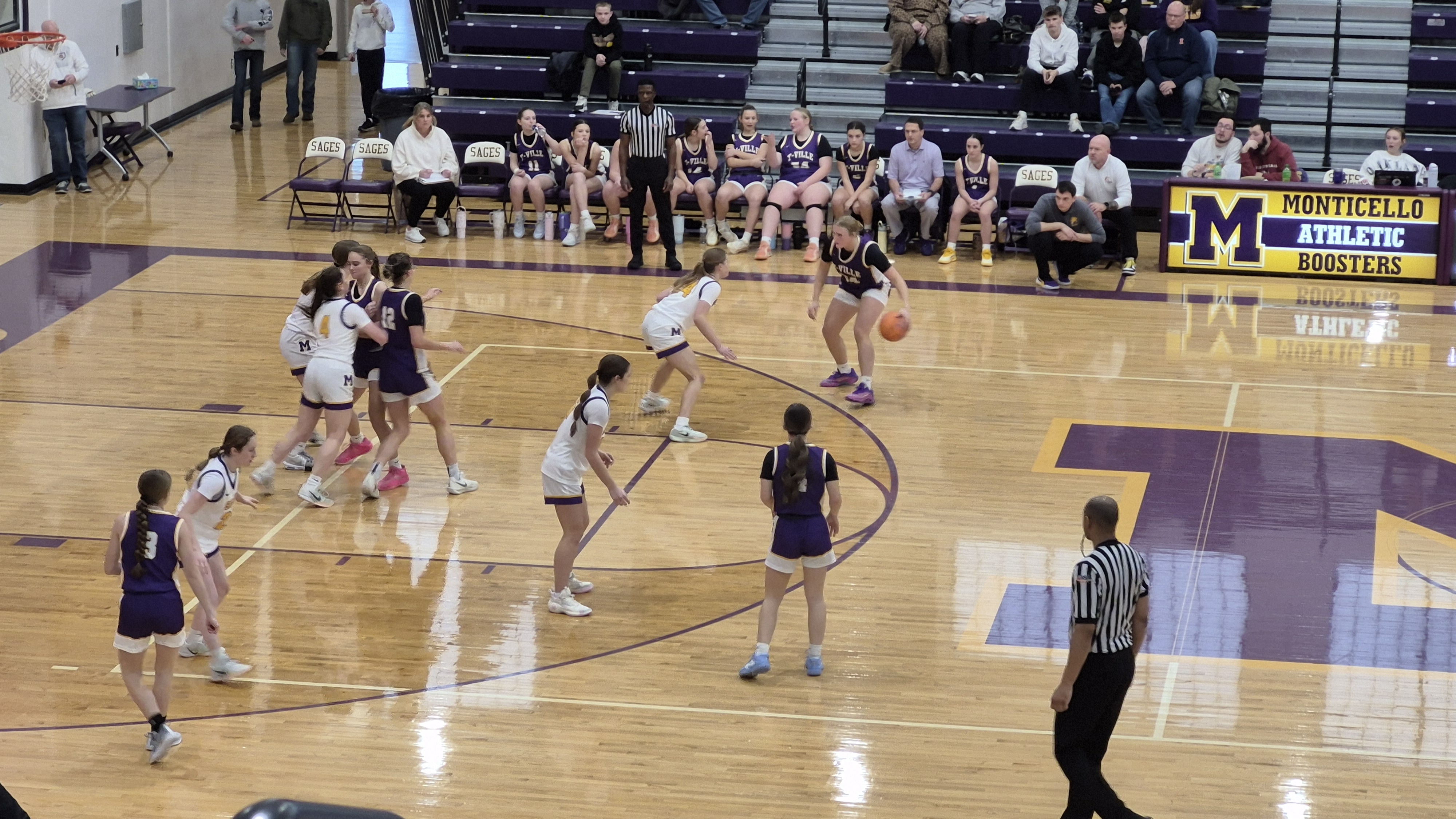 The two purple-and-gold teams were arguably colder on offense than the weather outside; neither side scored inside the first three minutes. The teams remained within touching distance throughout the first quarter. In the second, Monticello gained momentum and went up by eight points thanks to baskets from Ali Weidner and Kiara Grace. Taylorville answered back with scores from Peyton DeMichael - including a three - and Julie Wayman to ensure they trailed by only two heading to the changing rooms.