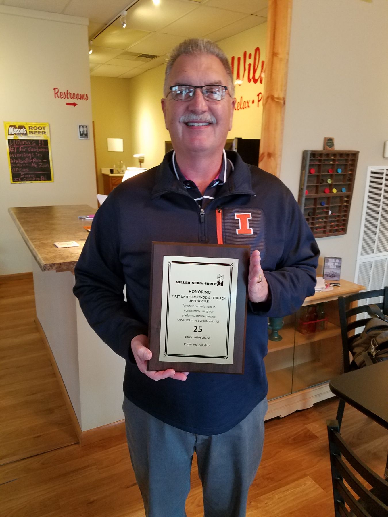 Jim Finks, representing First United Methodist Church of Shelbyville, which has had a Sunday morning broadcast on WSVZ 98.3 since January 1, 1998.